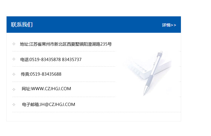 地址:常州市新北區友邦商務大廈1幢16、17層  電話:0519-85101652  傳真:0519-85112595  郵編:213022  網址:www.cz-jiayue_cn.sh-banqiu.com  郵箱:xiajifengaa@163.com